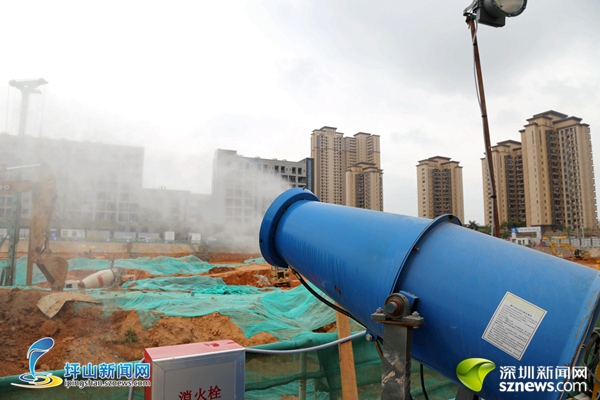 日前,在觀瀾街道地鐵四號線4302標(biāo)段施工工地上空,四套高聳的塔吊噴霧系統(tǒng)格外引人注目。