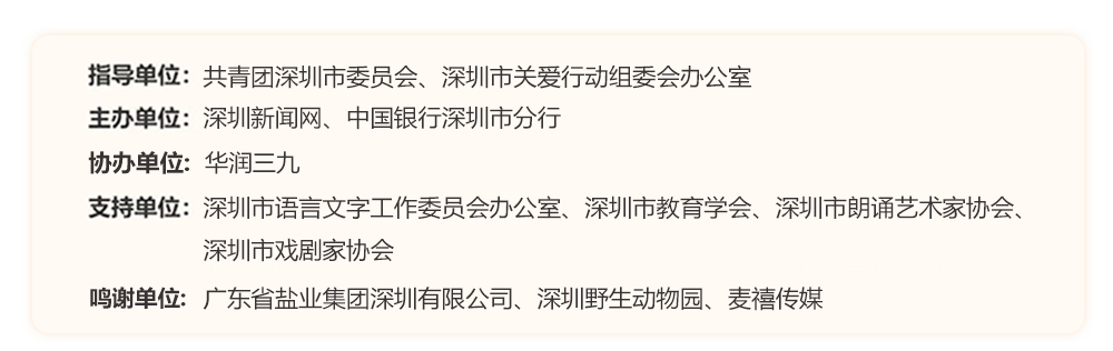 為助力建設(shè)良好的青少年閱讀環(huán)境,激發(fā)學(xué)生閱讀興趣,倡導(dǎo)親子閱讀,共建和諧家庭關(guān)系。2022年,“誰是故事大王·第六季”在共青團深圳市委員會、深圳市關(guān)愛行動組委會辦公室的指導(dǎo)下再出發(fā)?;顒佑缮钲谛侣劸W(wǎng)、中國銀行深圳市分行主辦,華潤三九協(xié)辦,得到了廣東省鹽業(yè)集團深圳有限公司、深圳野生動物園、麥禧傳媒的大力支持。更長的活動周期,更豐富的參與形式,更專業(yè)的賽制,等你來解鎖與挑戰(zhàn)!讓閱讀成為最動人的風(fēng)景,讓故事的魅力感動深圳。說明:所有參賽者報名成功后,均承認并允許主辦方將個人參加本次活動的照片或視頻相關(guān)資料刊發(fā)在各類媒體雜志報紙上,用于活動宣傳。